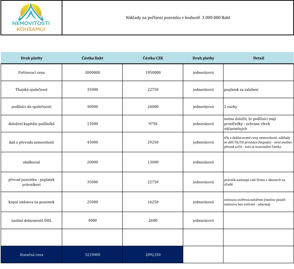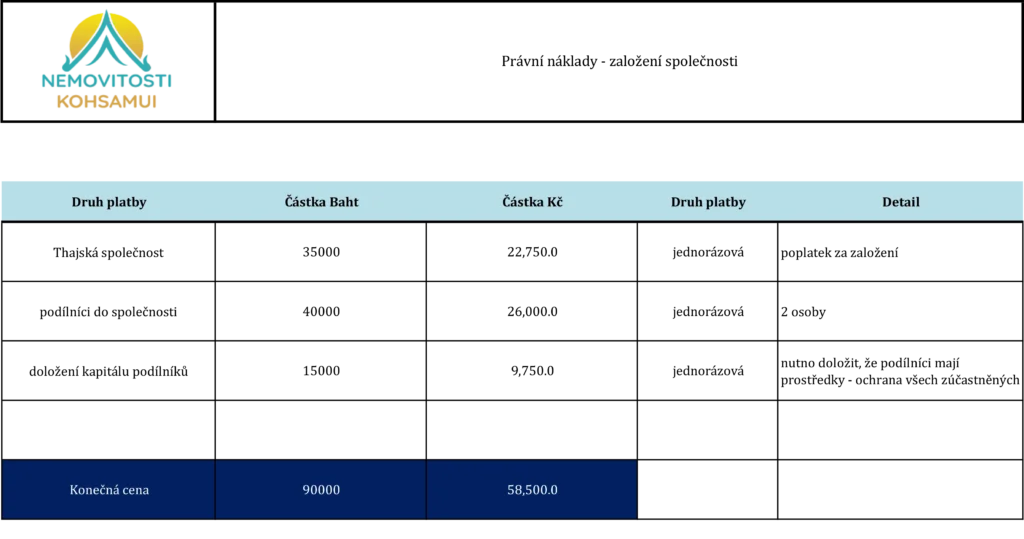 Vlastnictví pozemku prostřednictvím thajské společnosti je běžným způsobem, jak získat nemovitost v Thajsku. Tento postup je na Koh Samui, potažmo v Thajsku, velmi populární a je doporučován i zahraničními odborníky. Je však potřeba počítat s tím, že se jedná o komplexní proces a je v řadě případů je nutné uplatnit “obálkovou metodu”. Thajské úřady uplatňují odlišný přístup v různých správních oblastech, je proto nutné se předem informovat. Postupy a náklady se mohou také měnit v závislosti na situaci a aktuálních nařízeních.