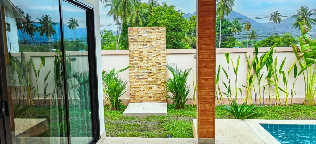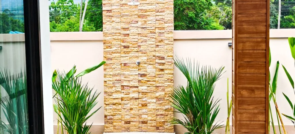 Outdoor shower with stone tiling: Ideal for refreshment on hot days.