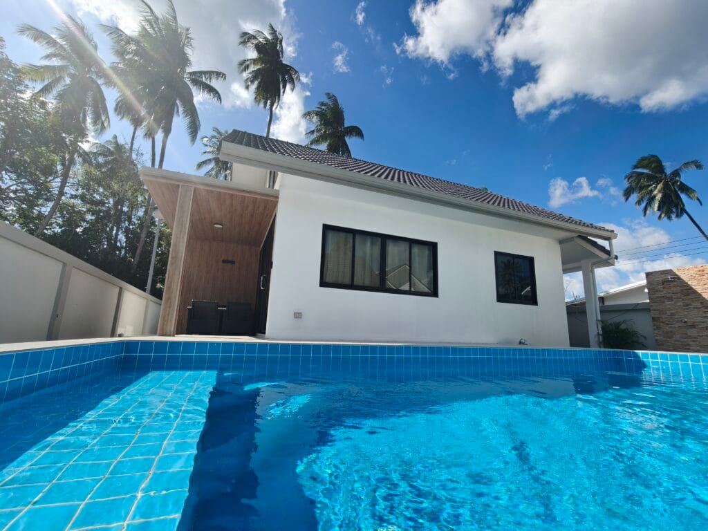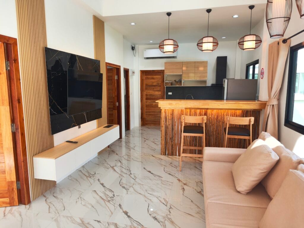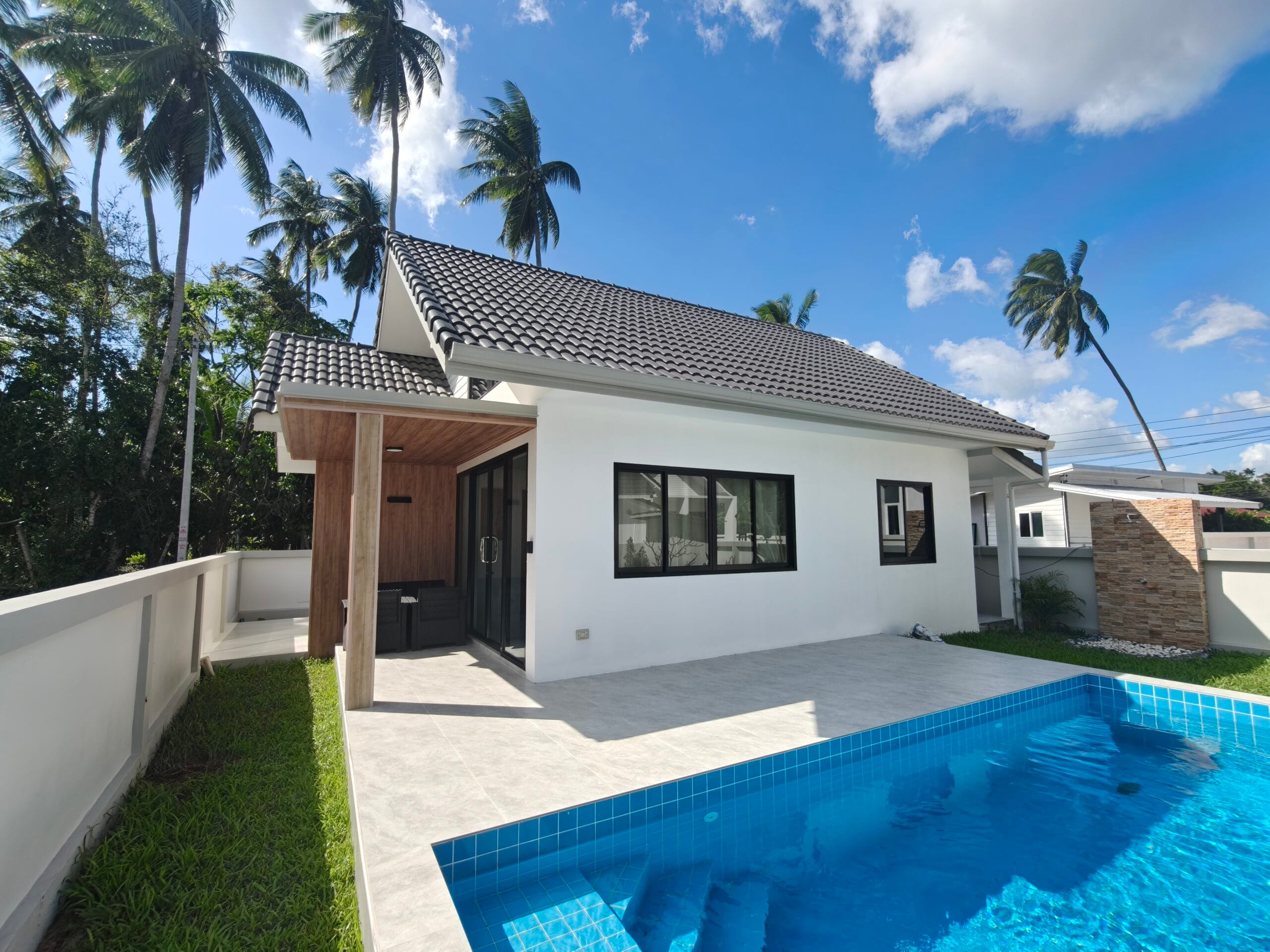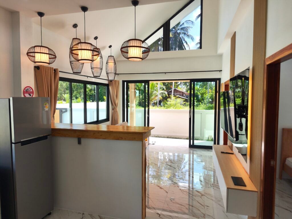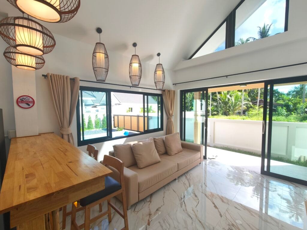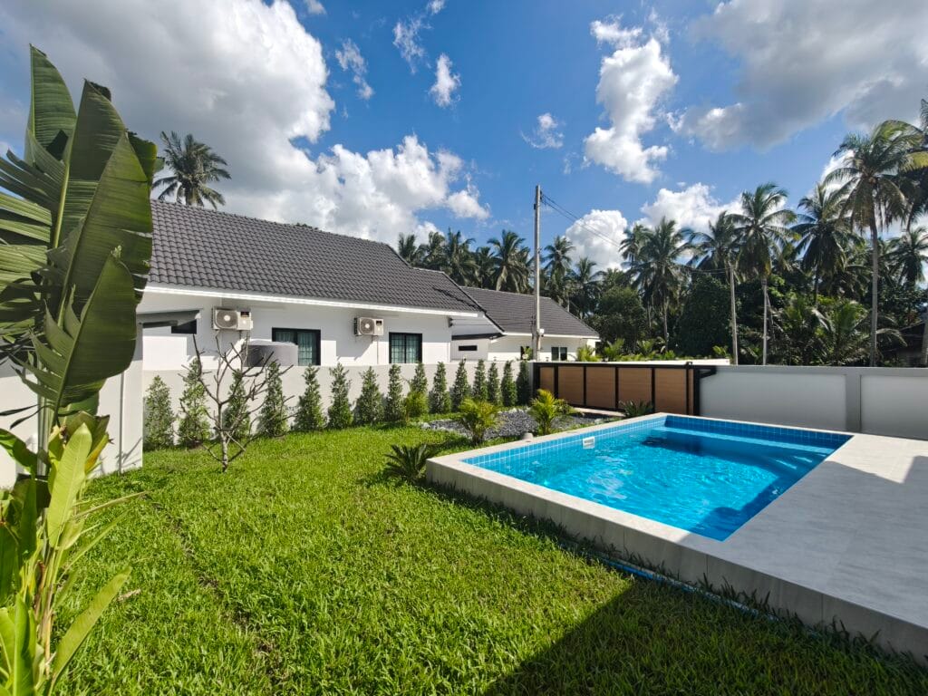 Apartment villa with private pool (6×3 m), just 1.9 km from Taling Ngam Beach. The villa offers two bedrooms. It includes a fully equipped kitchen with quality brickwork with select cabinets, a spacious living room with high ceiling and an outdoor terrace with anti-slip tiling. The kitchen and bathroom are connected by a bar with wood paneling and LED backlighting. The living room is decorated with a modern TV wall with LED backlighting and storage space. The garden with lawn, trees and outdoor shower in solid wood with stone base completes the harmony. Classic building techniques and modern features create a cozy home.