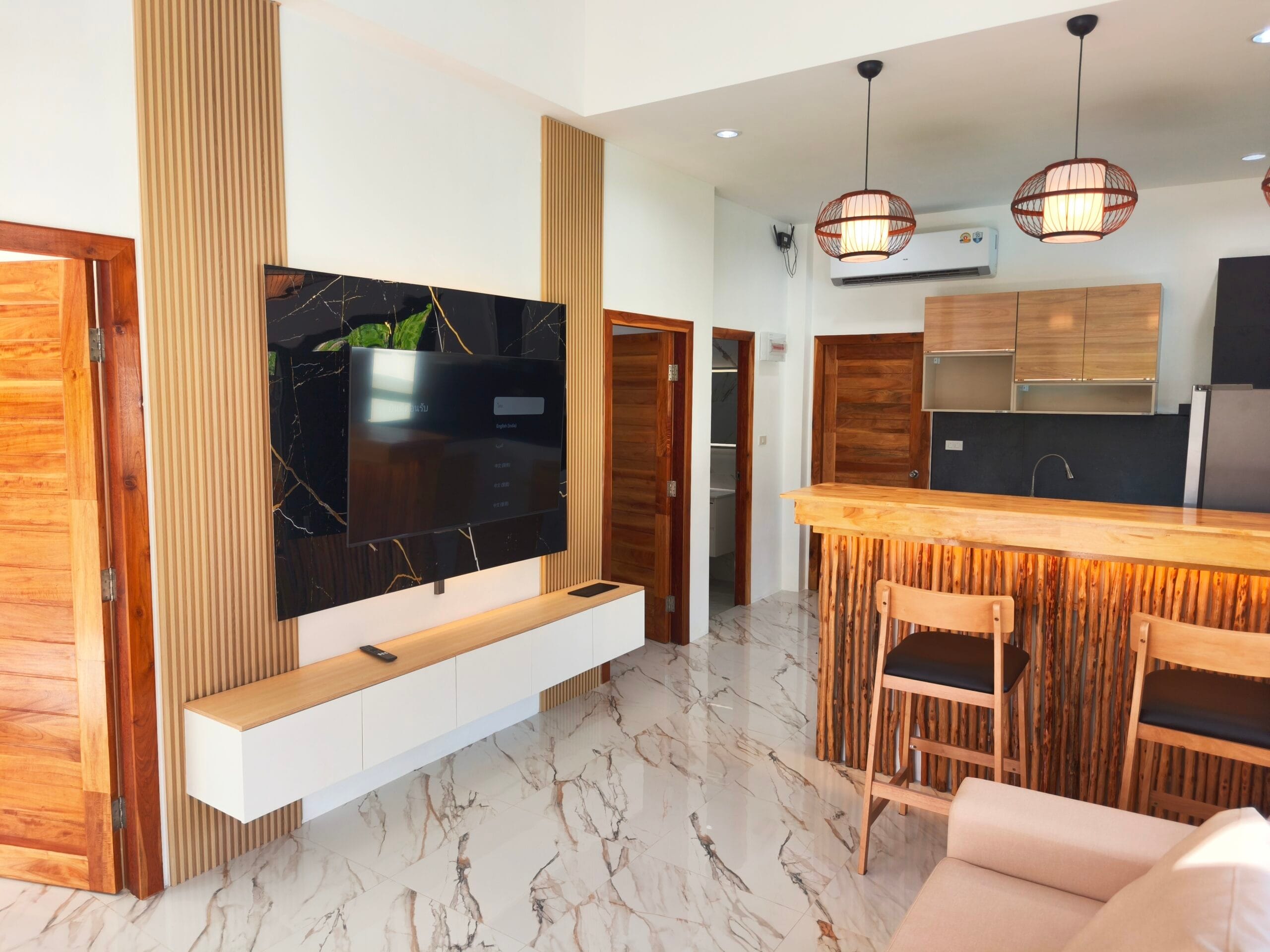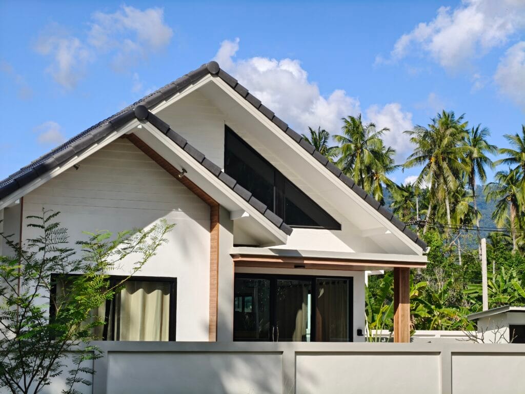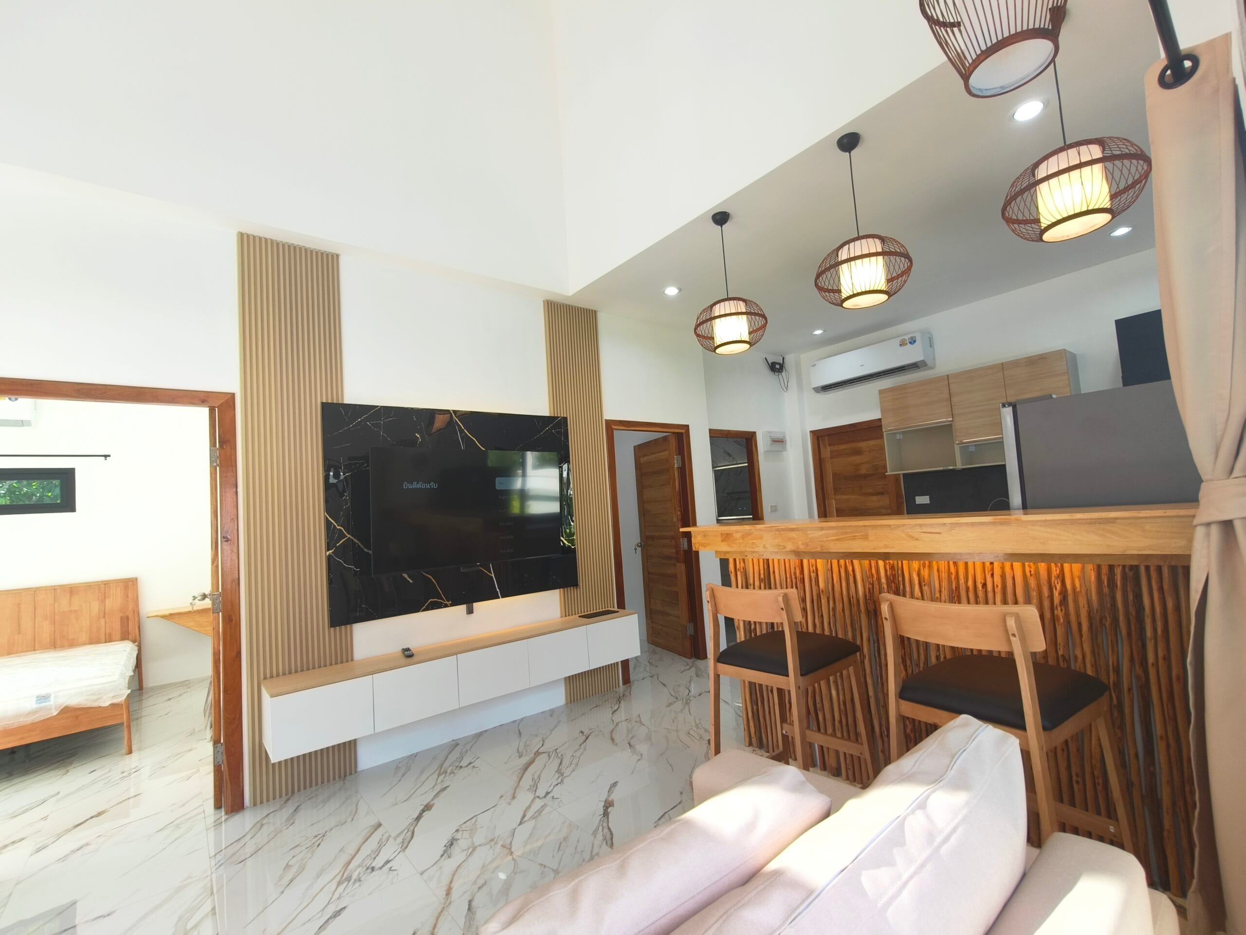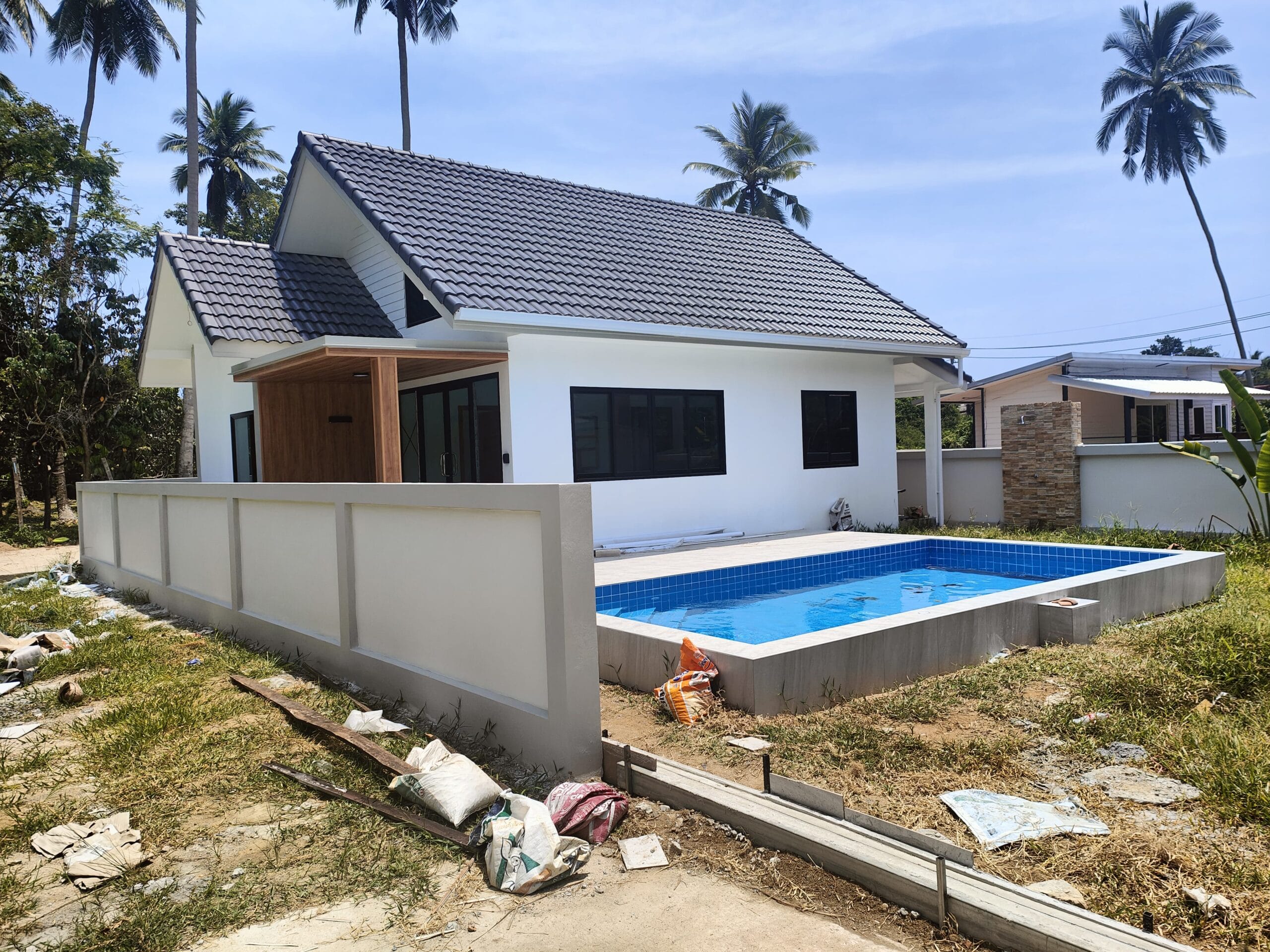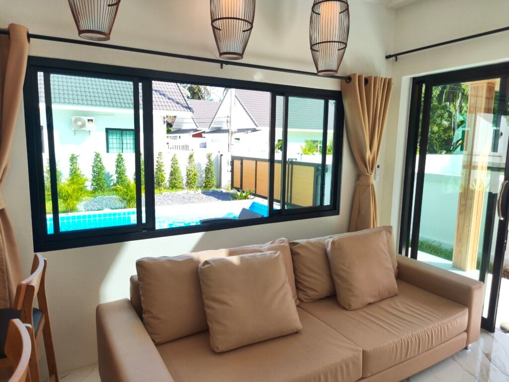 Apartment villa with private pool (6×3 m), just 1.9 km from Taling Ngam Beach. The villa offers two bedrooms. It includes a fully equipped kitchen with quality brickwork with select cabinets, a spacious living room with high ceiling and an outdoor terrace with anti-slip tiling. The kitchen and bathroom are connected by a bar with wood paneling and LED backlighting. The living room is decorated with a modern TV wall with LED backlighting and storage space. The garden with lawn, trees and outdoor shower in solid wood with stone base completes the harmony. Classic building techniques and modern features create a cozy home.