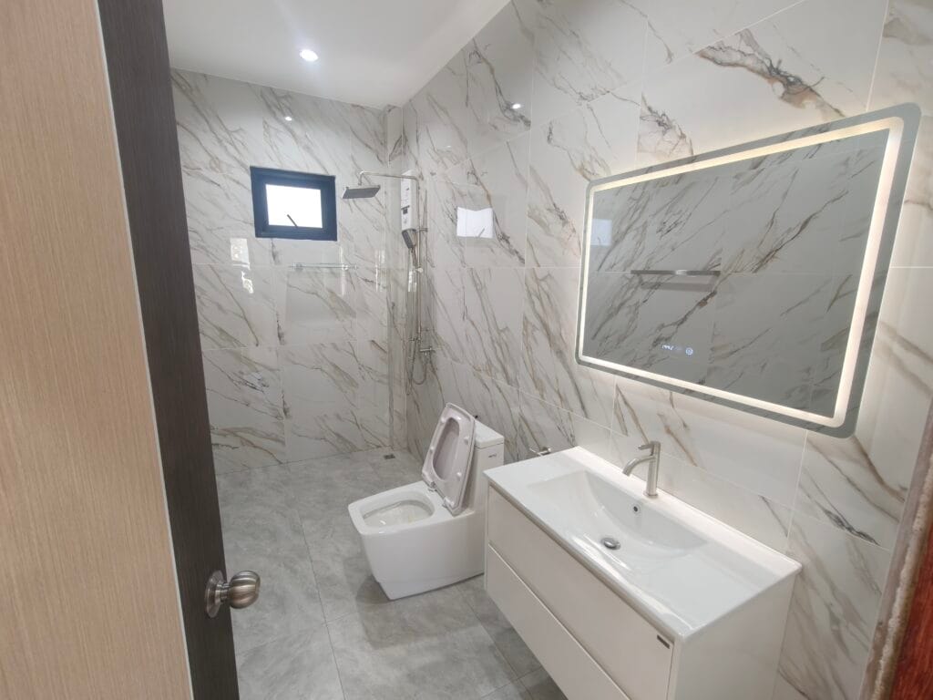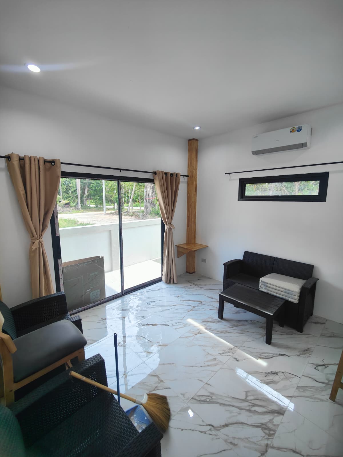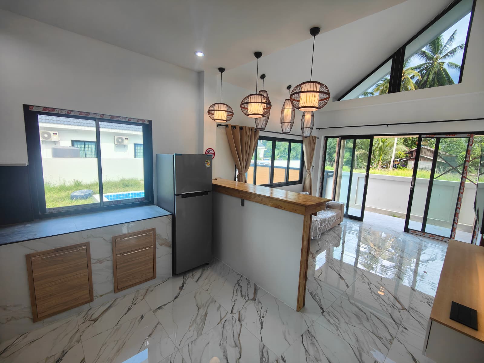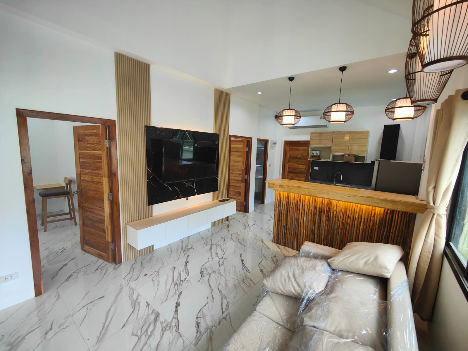 Apartment villa with private pool (6×3 m), just 1.9 km from Taling Ngam Beach. The villa offers two bedrooms. It includes a fully equipped kitchen with quality brickwork with select cabinets, a spacious living room with high ceiling and an outdoor terrace with anti-slip tiling. The kitchen and bathroom are connected by a bar with wood paneling and LED backlighting. The living room is decorated with a modern TV wall with LED backlighting and storage space. The garden with lawn, trees and outdoor shower in solid wood with stone base completes the harmony. Classic building techniques and modern features create a cozy home.