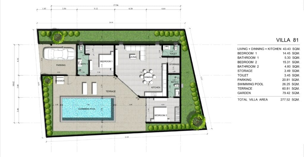 Pozemek vily o rozloze 303 m² poskytuje dostatek prostoru pro venkovní relax. Ať už se budete opalovat na tropickém slunci u soukromého bazénu nebo si dopřávat klidné chvíle uprostřed svěží zeleně, venkovní prostory vily nabízejí útočiště pro relaxaci a regeneraci.