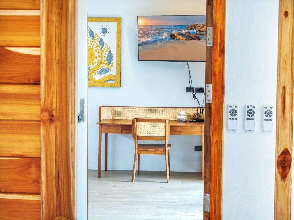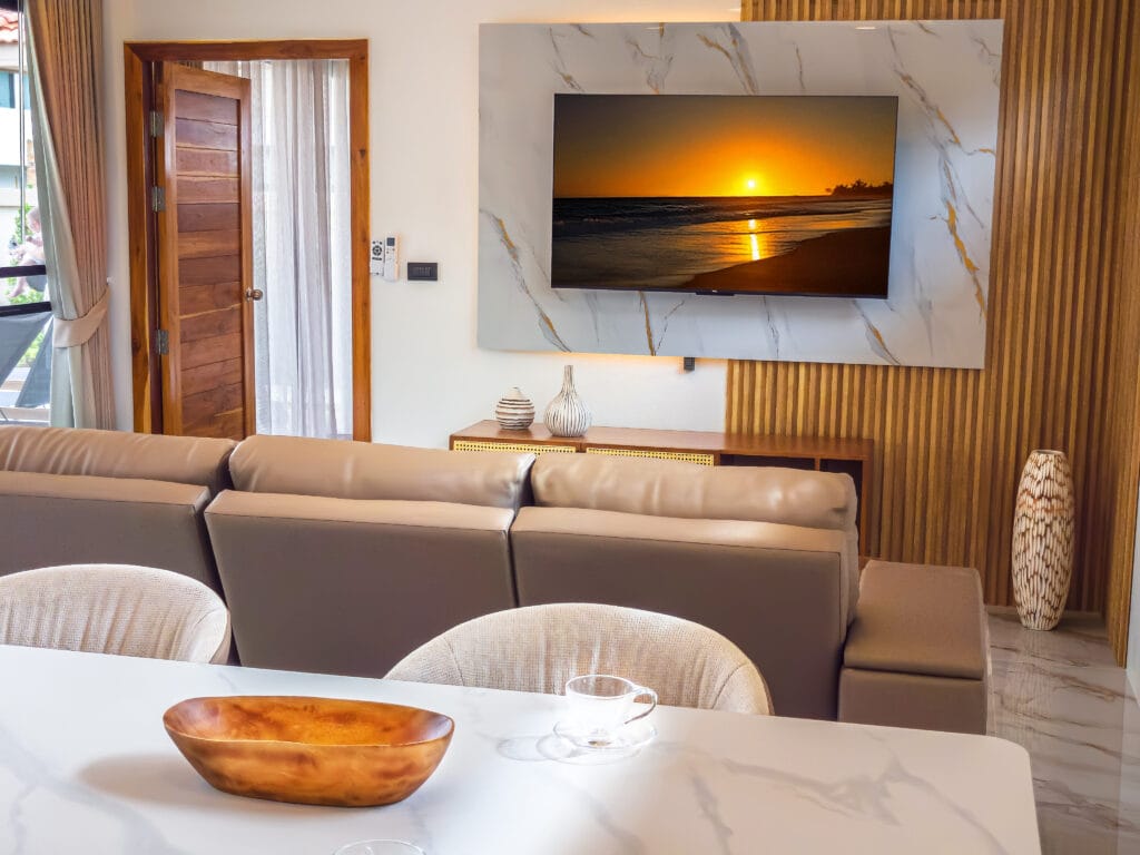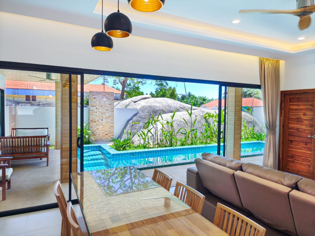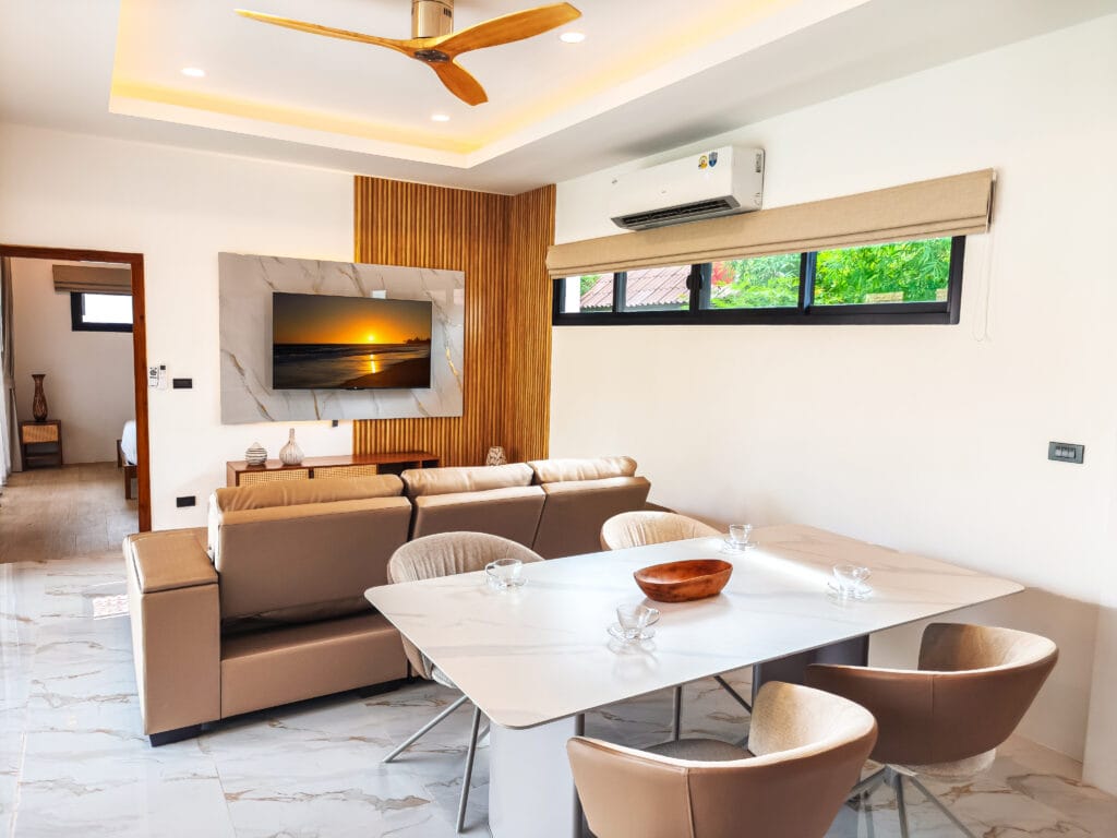 Vily dokonale kombinují moderní pohodlí s kouzlem ostrova. Každá rezidence je plně vybavena vysoce kvalitními zařízeními, včetně stylové kuchyně s varnou deskou, digestoří a dostatkem úložného prostoru. Odpočiňte si v pohodlném obývacím pokoji se stropním ventilátorem a kvalitní sedací soupravou. Posuvné teakové dveře v obývacím pokoji a ložnicích stírají hranice mezi vnitřním a venkovním prostorem a umožňují průchod tropického vánku.