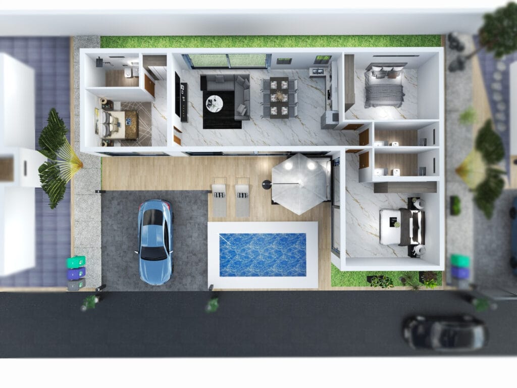 Chápeme, že váš vysněný domov by měl odrážet váš jedinečný styl. Proto vám projekt nabízí možnost přizpůsobit si vilu výběrem podlah, koupelnových dlaždic, barvy kuchyně a dokonce i barvy dlaždic v bazénu, což vám umožní vytvořit prostor, který odráží vaši osobnost.