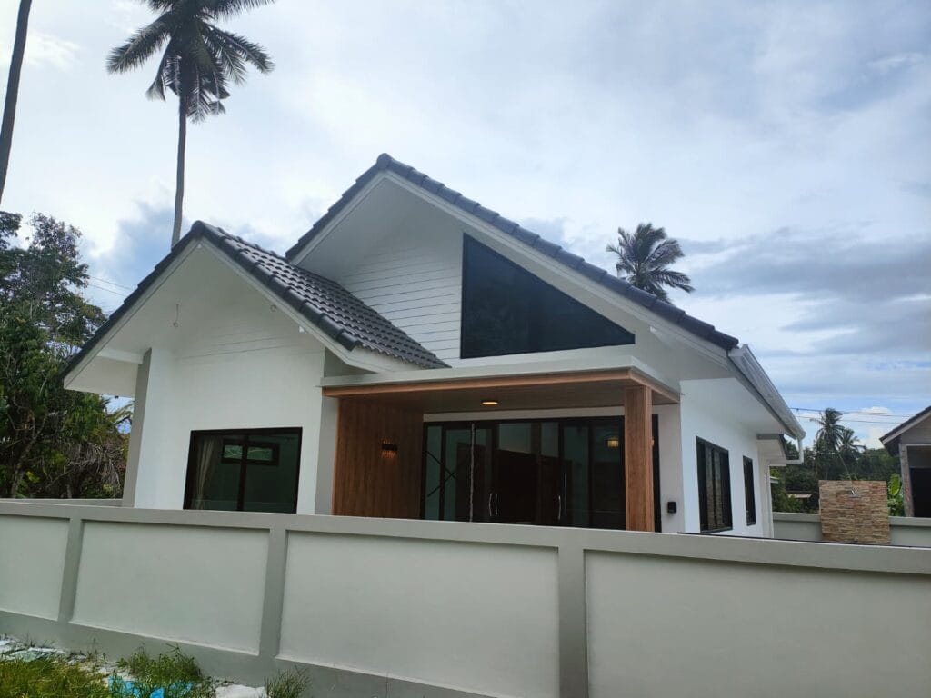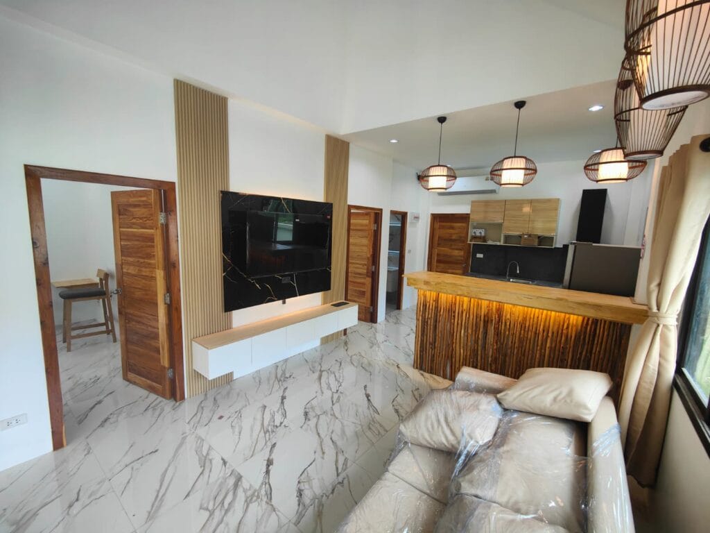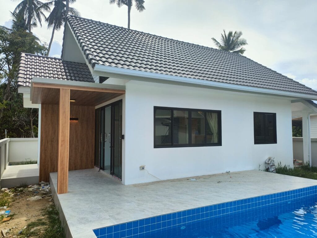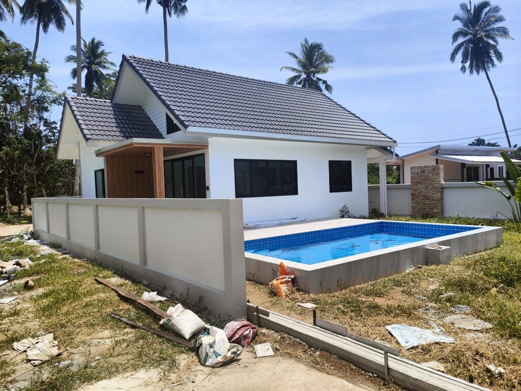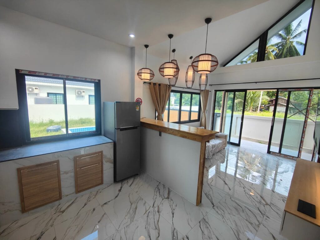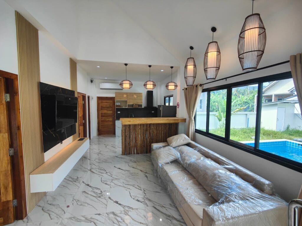 Apartmánová vila s privátním bazénem (6×3 m), jen 1,9 km od pláže Taling Ngam. Vila nabízí dvě ložnice. Součástí je plně vybavená kuchyň s kvalitní vyzděnou linkou s výběrovými skříňkami, prostorný obývací pokoj s vysokým stropem a venkovní terasa s protikluzovým obkladem. Kuchyň a koupelnu propojuje barový pult s dřevěným obkladem a LED podsvícením. Obývací pokoj zdobí moderní TV stěna s LED podsvícenou deskou a úložným prostorem. Zahrada s trávníkem, stromy a venkovní sprchou v dřevěném masivu s kamennou základnou dotváří harmonii. Klasické stavební postupy a moderní prvky vytvářejí útulný domov.