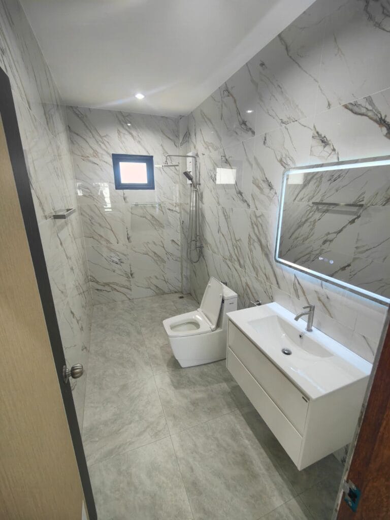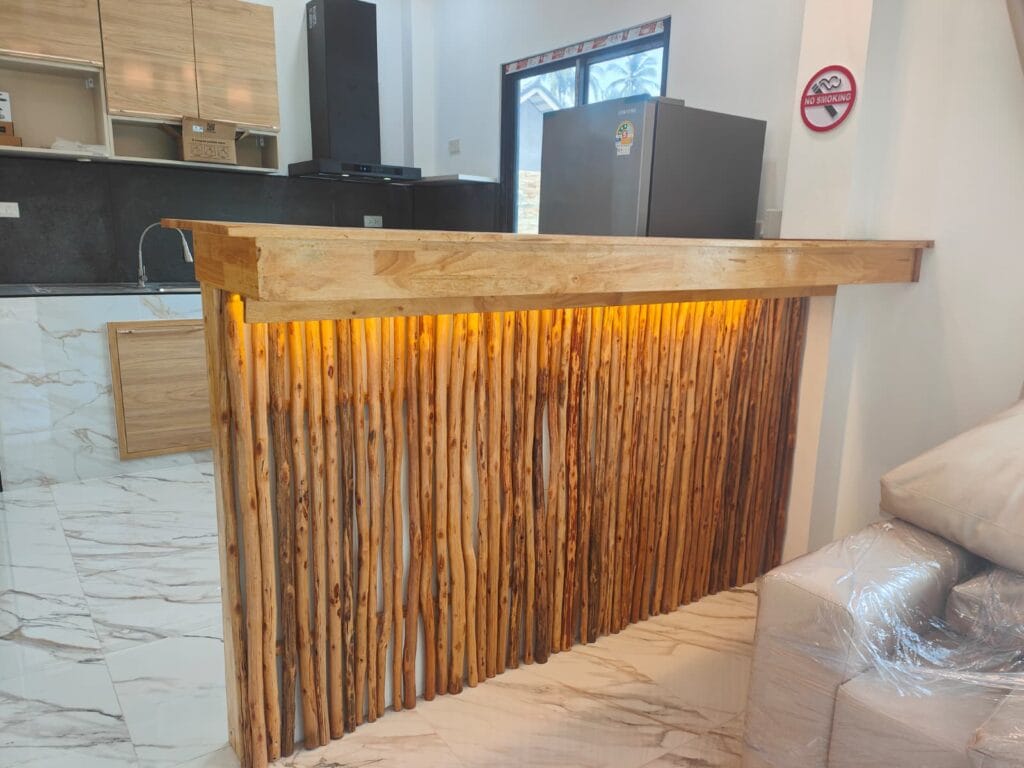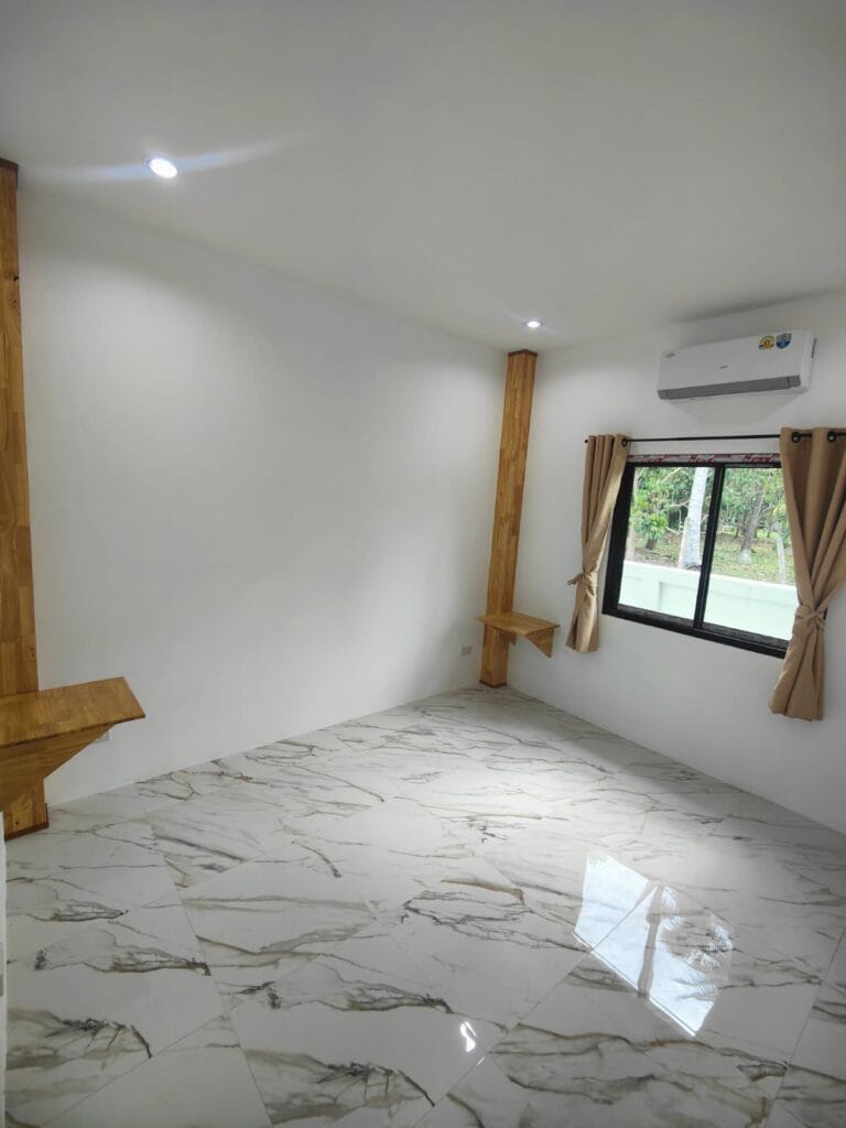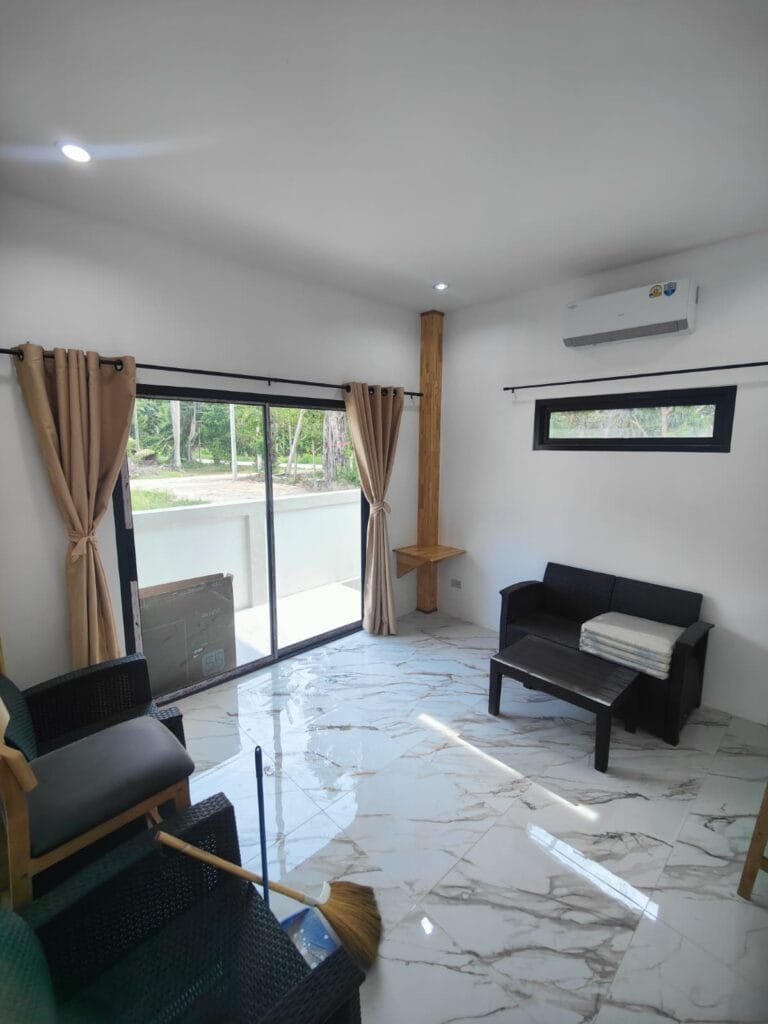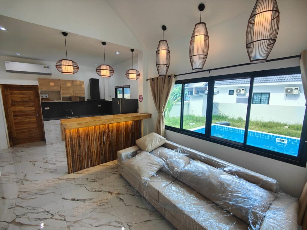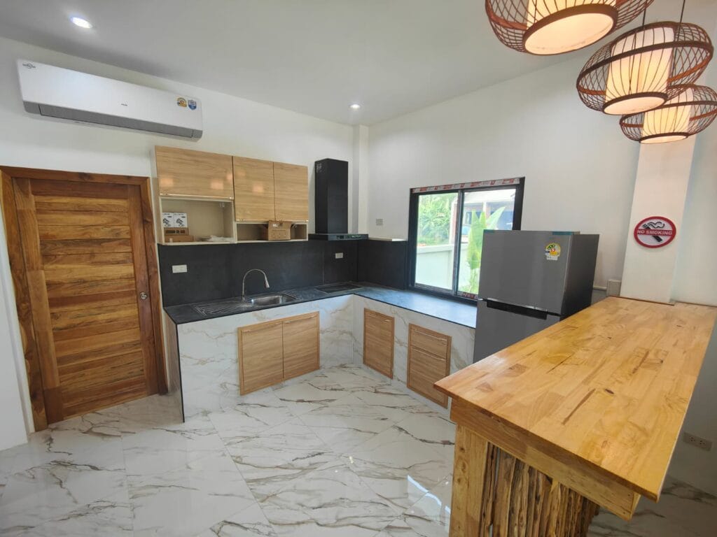 Apartmánová vila s privátním bazénem (6×3 m), jen 1,9 km od pláže Taling Ngam. Vila nabízí dvě ložnice. Součástí je plně vybavená kuchyň s kvalitní vyzděnou linkou s výběrovými skříňkami, prostorný obývací pokoj s vysokým stropem a venkovní terasa s protikluzovým obkladem. Kuchyň a koupelnu propojuje barový pult s dřevěným obkladem a LED podsvícením. Obývací pokoj zdobí moderní TV stěna s LED podsvícenou deskou a úložným prostorem. Zahrada s trávníkem, stromy a venkovní sprchou v dřevěném masivu s kamennou základnou dotváří harmonii. Klasické stavební postupy a moderní prvky vytvářejí útulný domov.