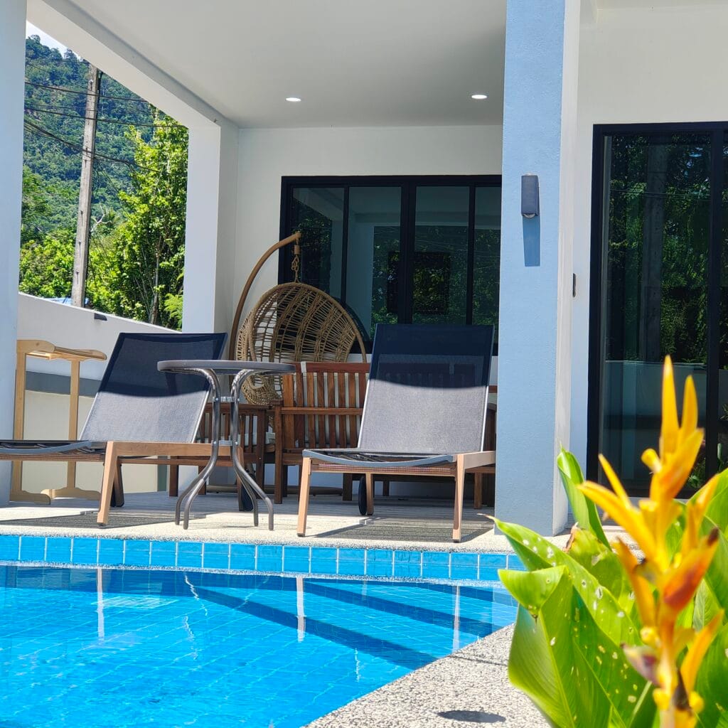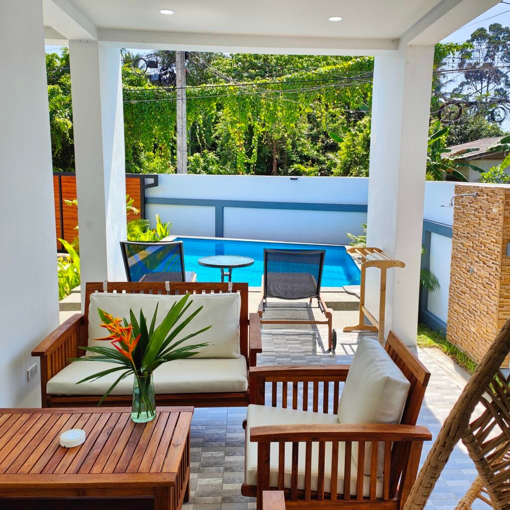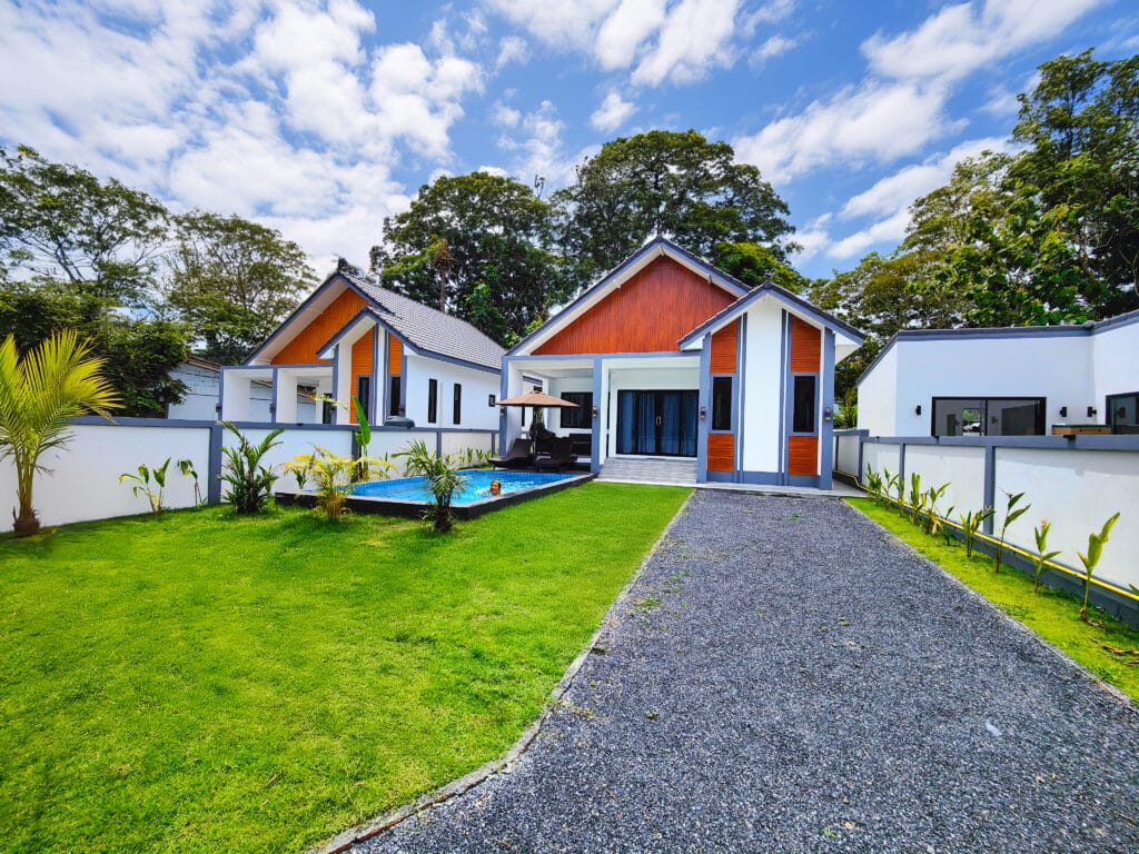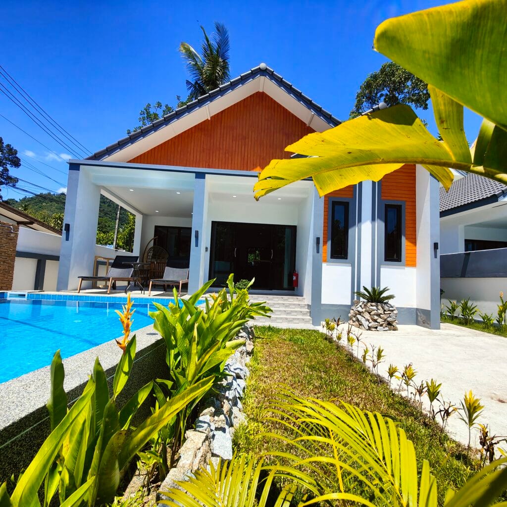 Dva vilové domy v nordickém stylu s třemi ložnicemi a bazénem (6×3 m), jen 1,3 km od pláže Lipa Noi.