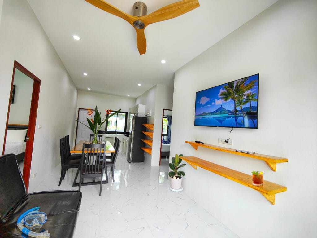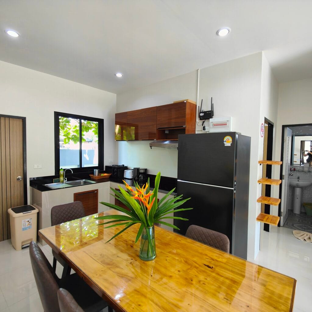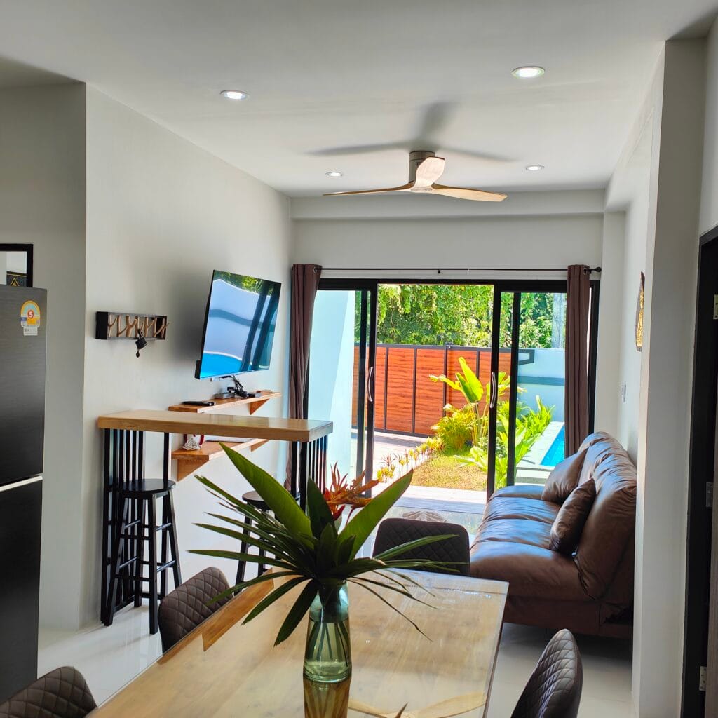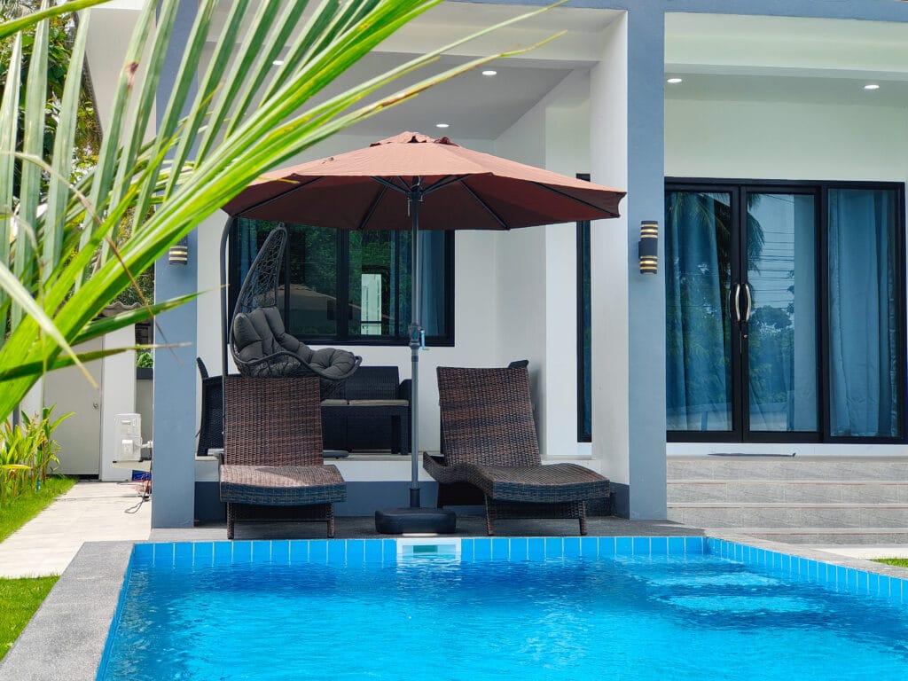 Dva vilové domy v nordickém stylu s třemi ložnicemi a bazénem (6×3 m), jen 1,3 km od pláže Lipa Noi.