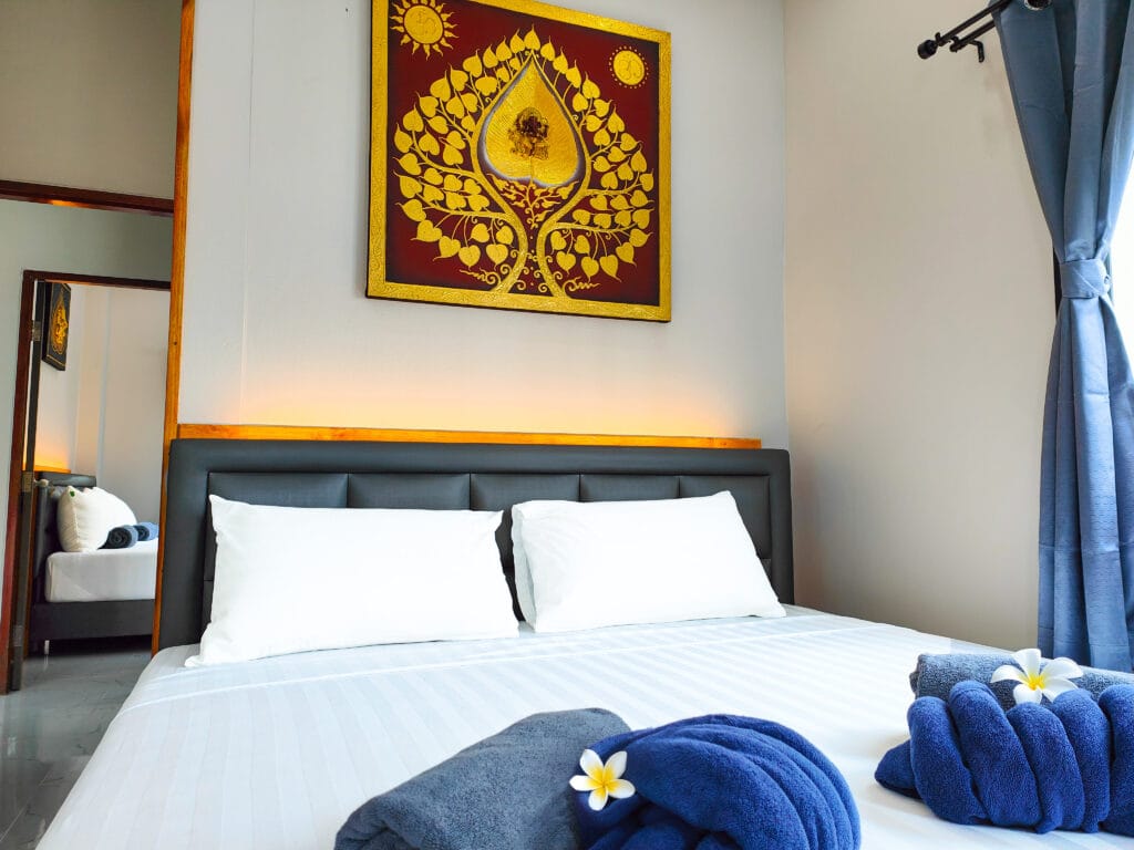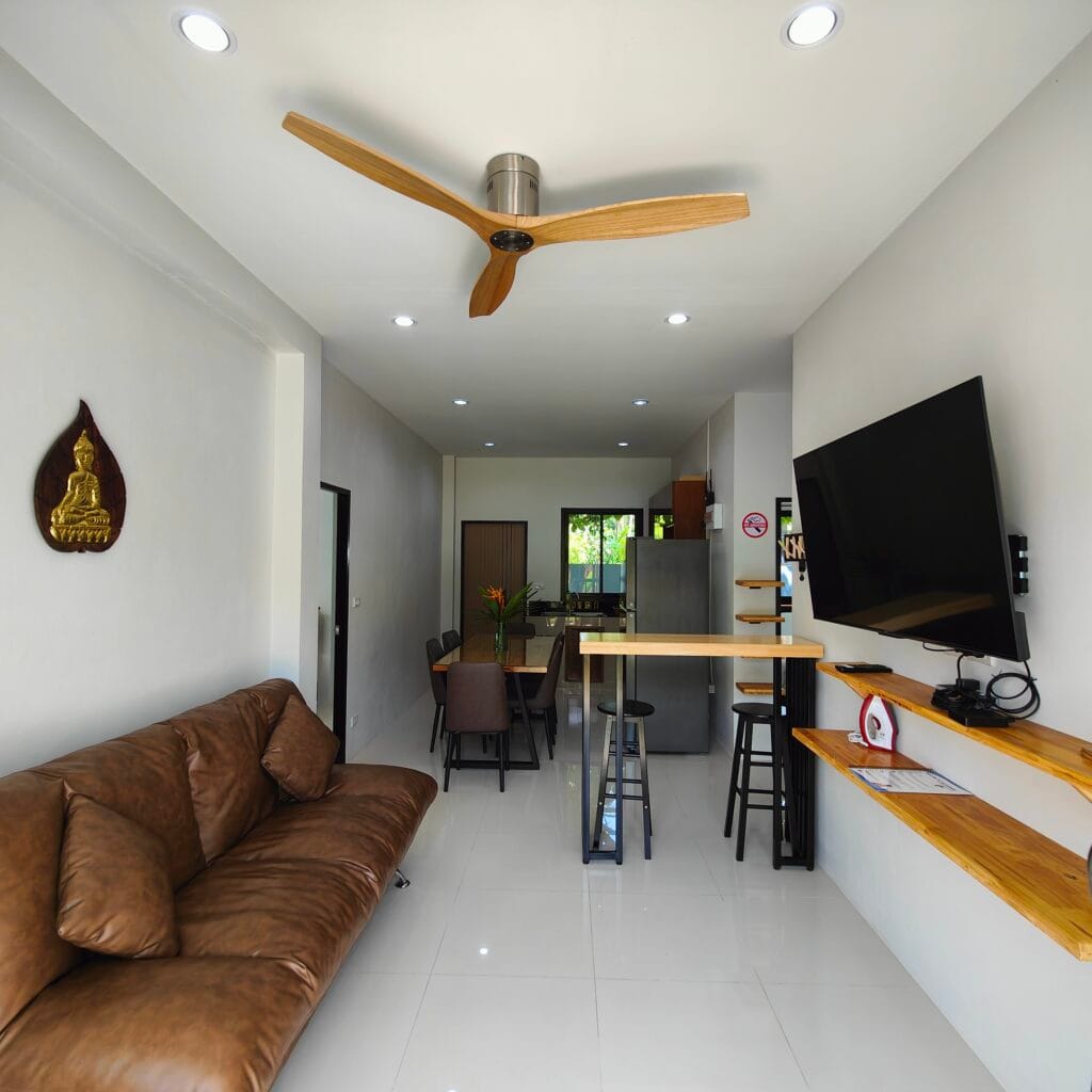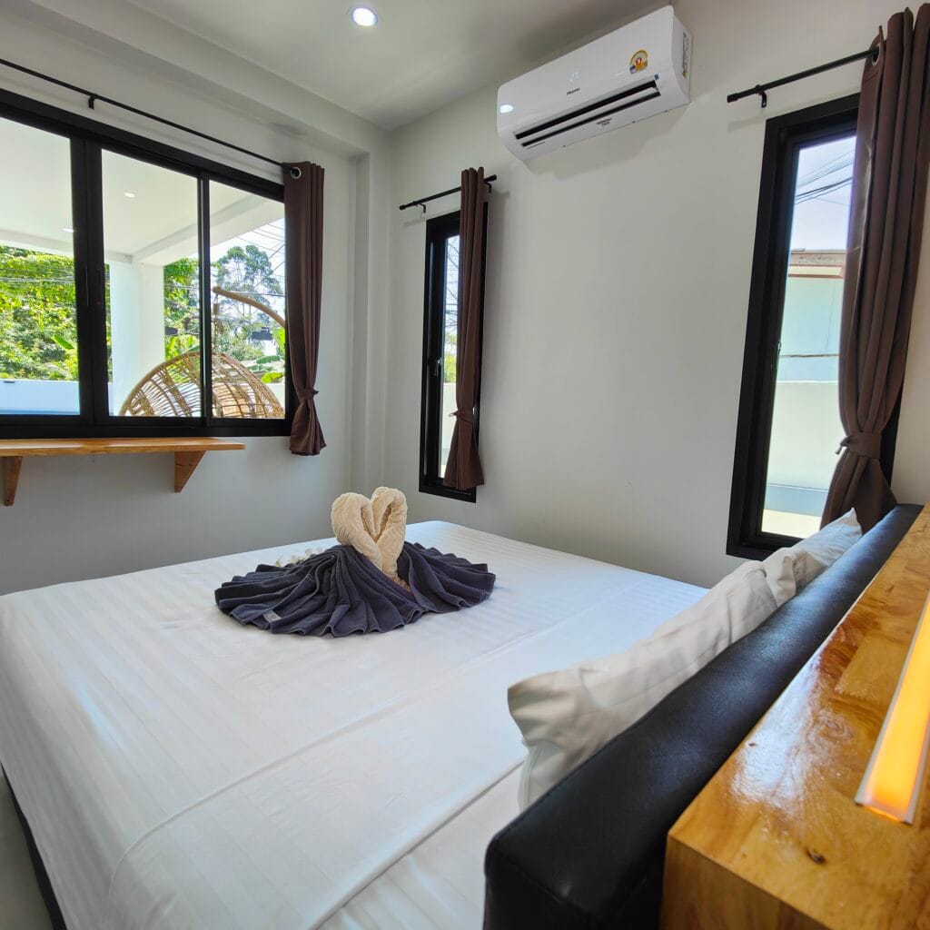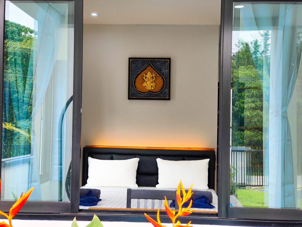 Ložnice mají dřevěné odkládací plochy s LED podsvícením. Zahrada s trávníkem, stromy a venkovní sprchou s kamenným obkladem podtrhuje moderní nordický styl s thajskými prvky, oblíbený mezi hosty.